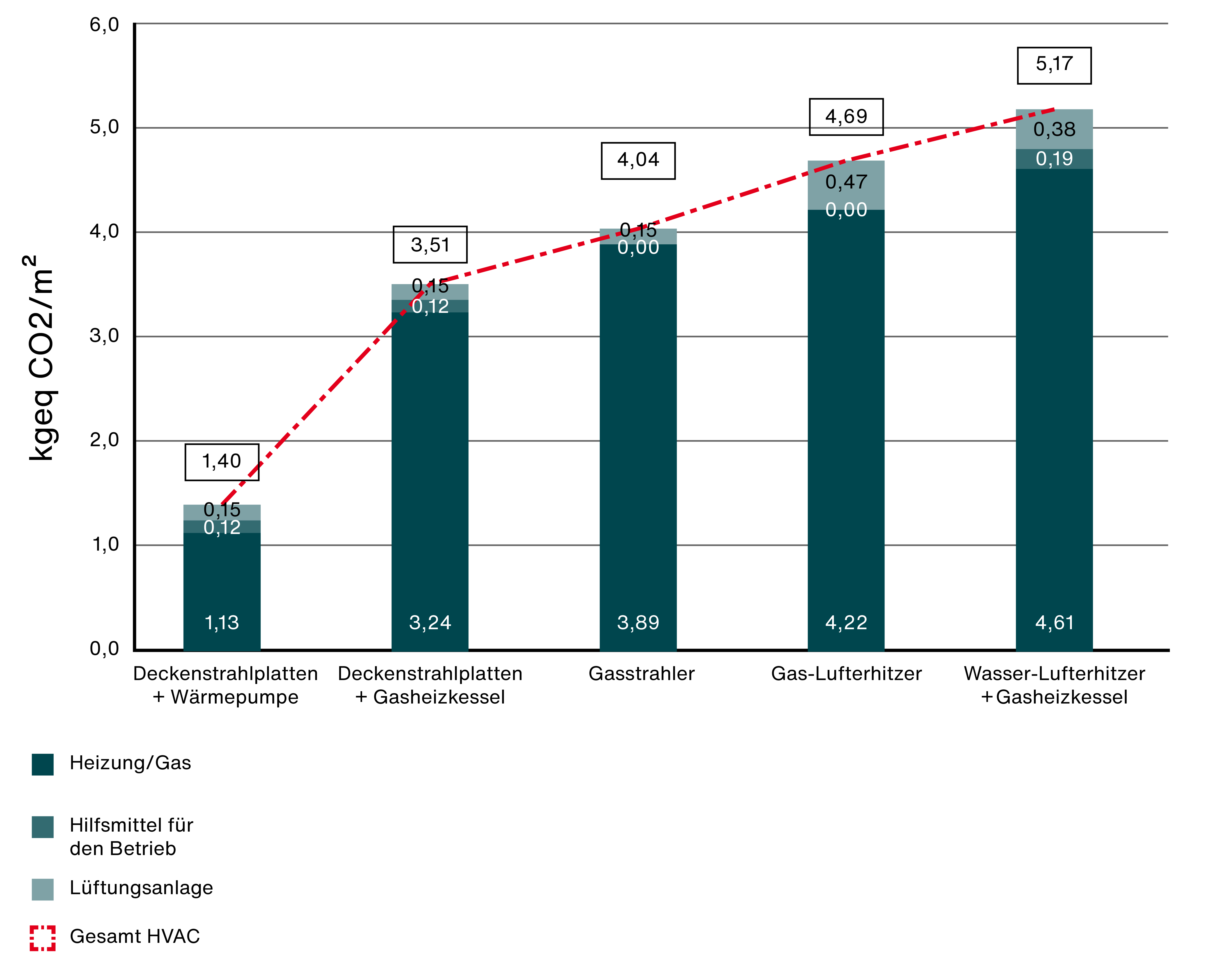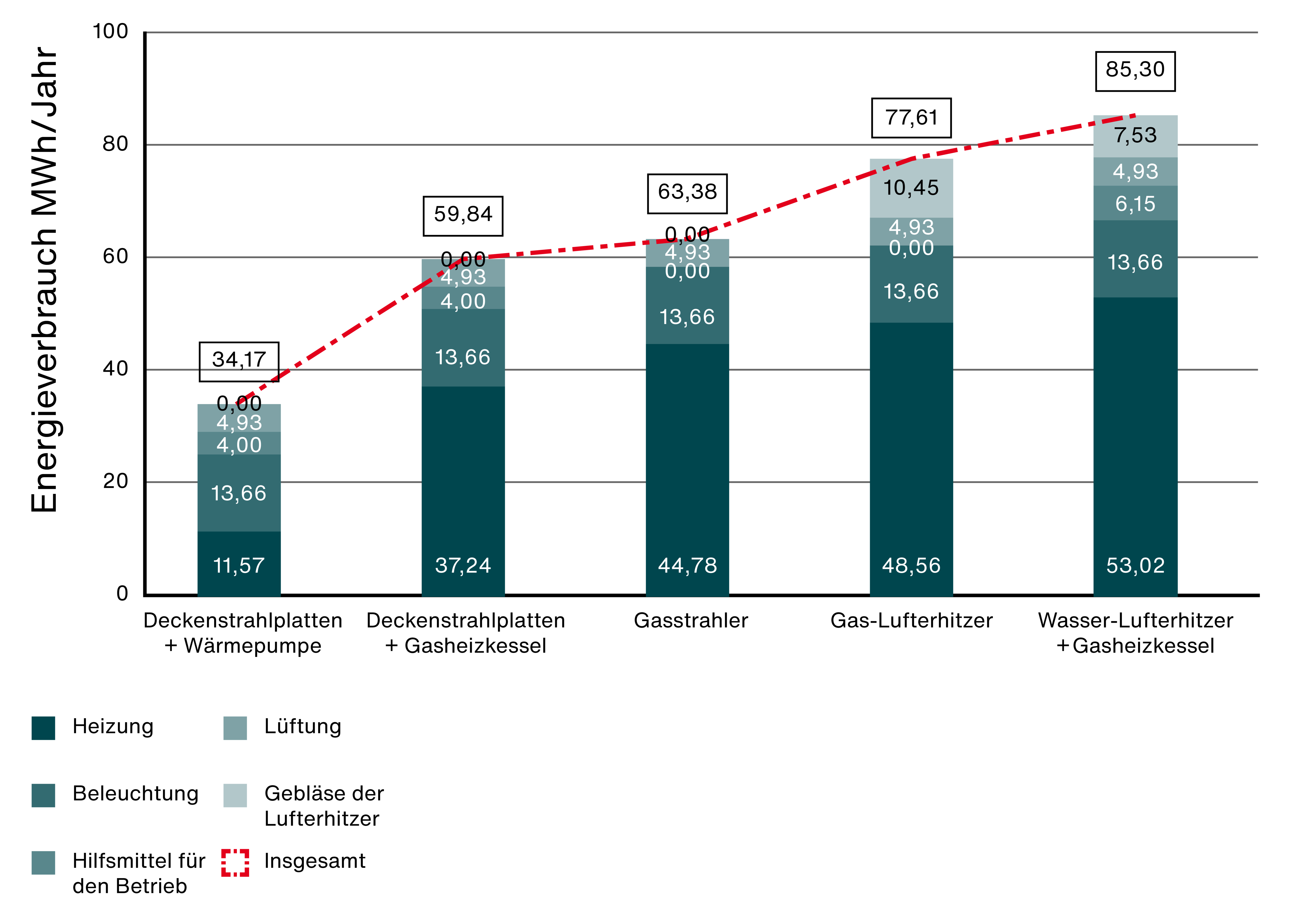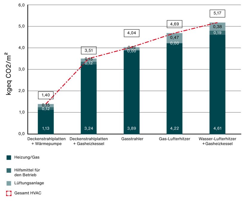 Das Heizsystem aus Deckenstrahlplatten mit Wärmepumpen reduzieren den Energieverbrauch gegenüber den anderen Systemen um bis zu 59 %. Beim Einsatz von Gas als Energieträger sind Deckenstrahlplatten mit einem Gasheizkessel die effizienteste Lösung. Gegenüber einem Wasser-Lufterhitzer spart der Einsatz von Deckenstrahlplatten als Wärmeemitter 22 % Energie.
