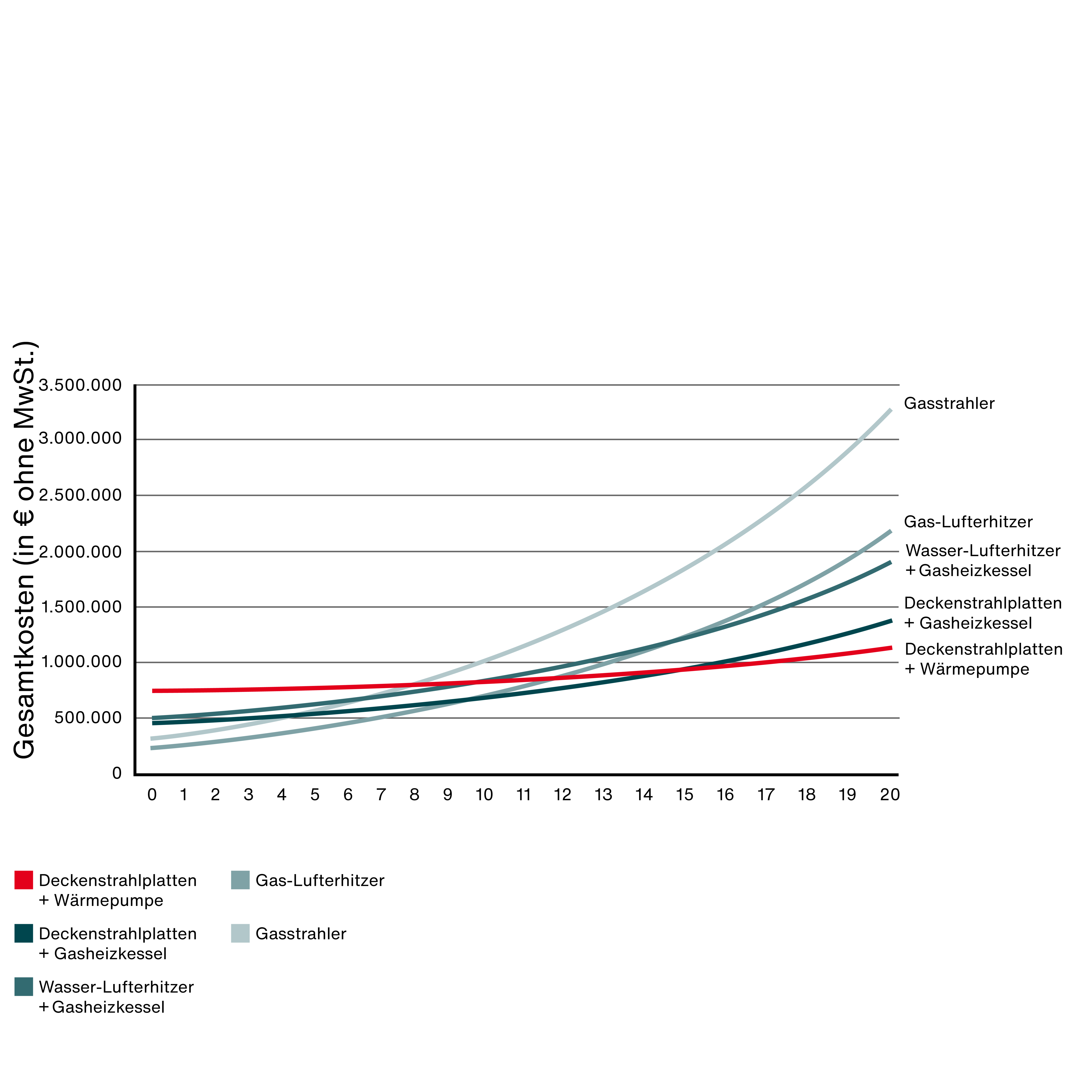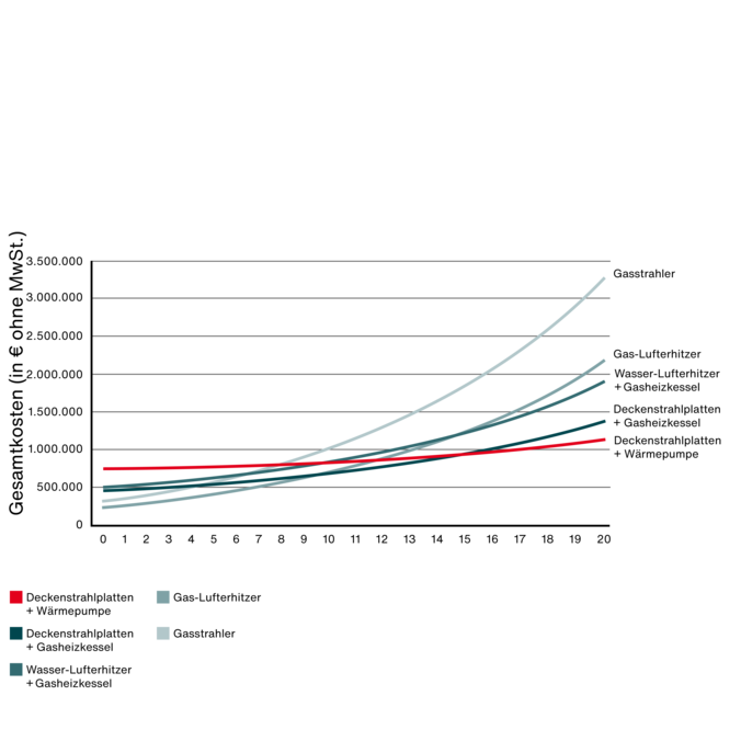 Die höchsten Investitionskosten haben Deckenstrahlplatten mit Wärmepumpe. Dem gegnüber stehen Gas-Lufterhitzer mit dem geringsten Startinvest. In knapp 8 Jahre haben die geringeren variablen Kosten der Deckenstrahlplatten mit Wärmepumpe den höheren Invest gegenüber Gas-Lufterhitzern getilgt . Nach einer Betriebsdauer von 15 Jahren sparen Deckenstrahlplatten mit Wärmepumpe gegenüber den anderen Heizsystemen Kosten von bis zu 59 %. Deckenstrahlplatten mit Gasheizkessel sparen Kosten von bis zu 49 %.