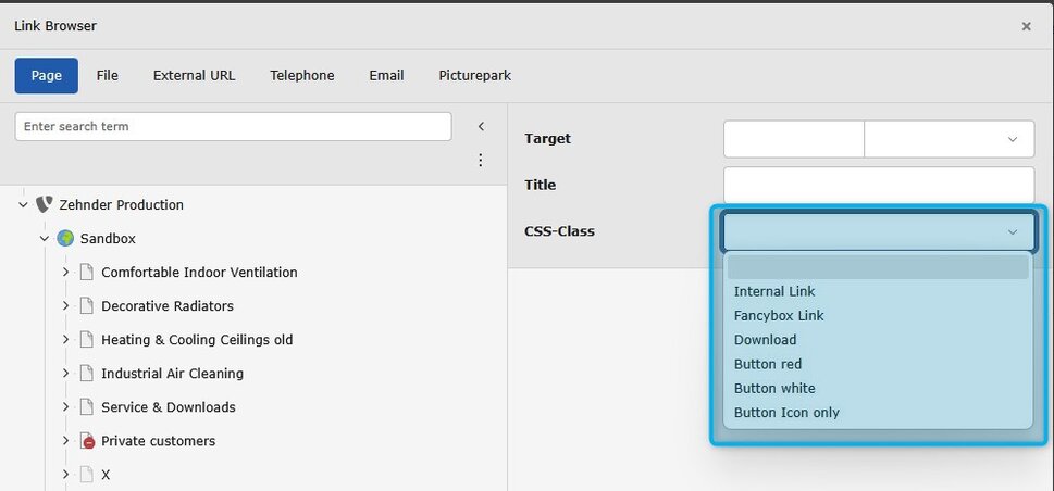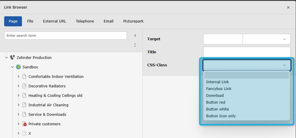 Our LinkBrowser Tools offer different CSS classes for links which, in the RTE, can be selected by Dropdown, can casewise be copy / pasted by text or for some content elements are already connected to the specific content element.