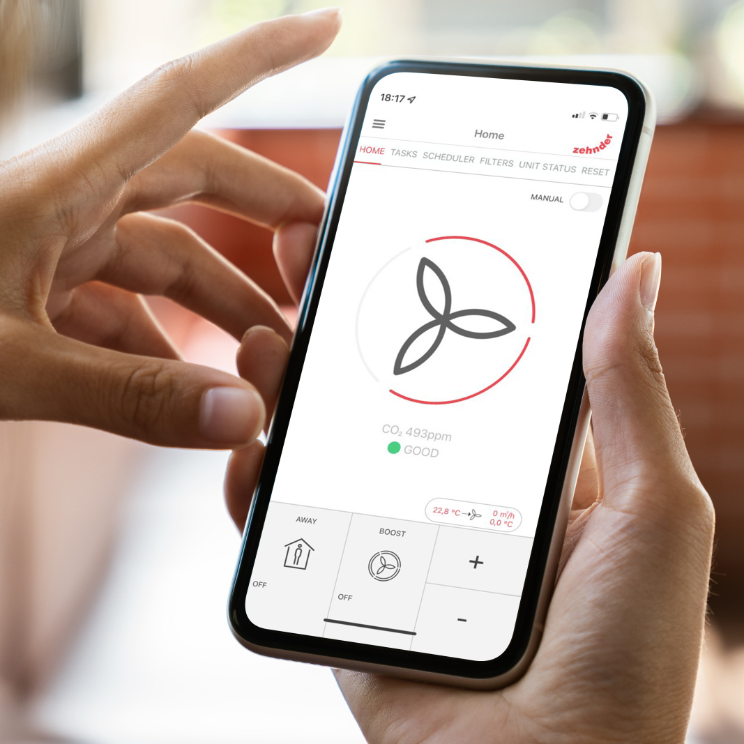 Within the local network of a home, the ventilation unit can be set and controlled via an app on a smartphone or tablet.