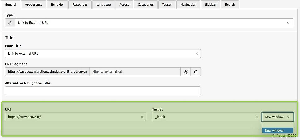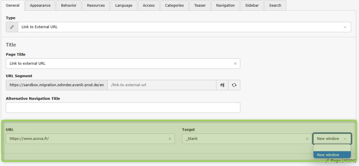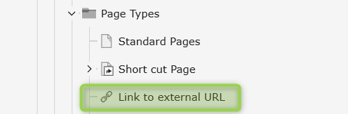 • Page type to directly redirect to an external URL or relative link with parameters within the currently selected  page tree.