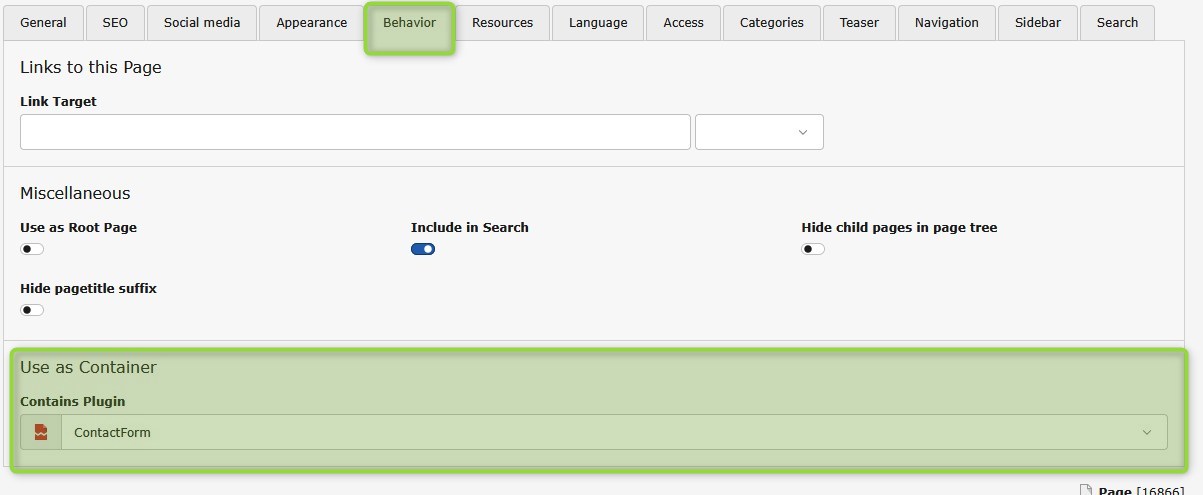 Don't miss to configure the ““Behaviour” settings of the page where the contact centre plugin is used to be used as container and containing the ”contactForm" plugin. After having configured the page as container, the “red cache” needs to be cleared by Typo3 agency to activate it.