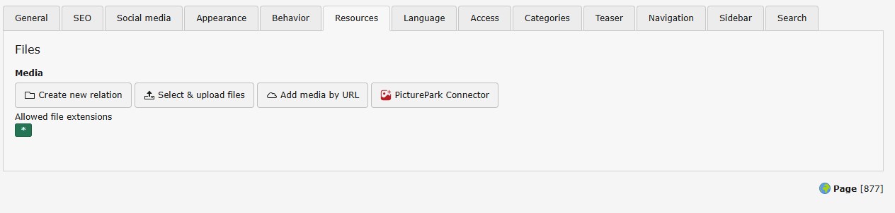 • This tab lets you link media files to the current page. How those files are handled depends on your frontend rendering configuration.