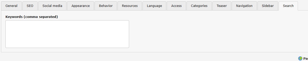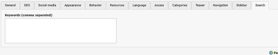 This tab lets you configure additional search terms connnected to your page which should be present in the nternal search solr index to present the page as result when searched for a specific term. Otherwise only text content of the page will be indexed connected to the page.