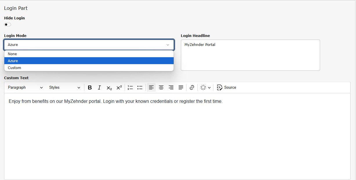 • Azure, which will offer headline, custom text and an Azure B2C connected login / logout button.