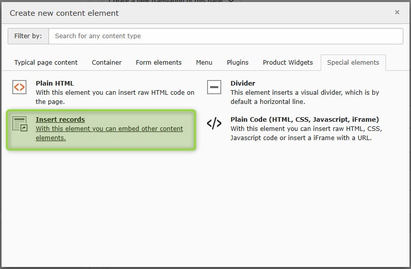 • content element to publish content elements of one typo3 page within the content area of other typo3 pages