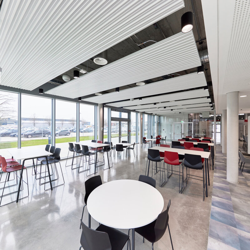Heating and cooling ceilings are available in open and closed versions. Therefore, there are many variants for integrating all kinds of other functional elements. Lamps, for example, can be integrated into cut-outs or mounted between or below the ceiling panels. Sprinklers, loudspeakers, air outlets, etc. are also placed in cut-outs.