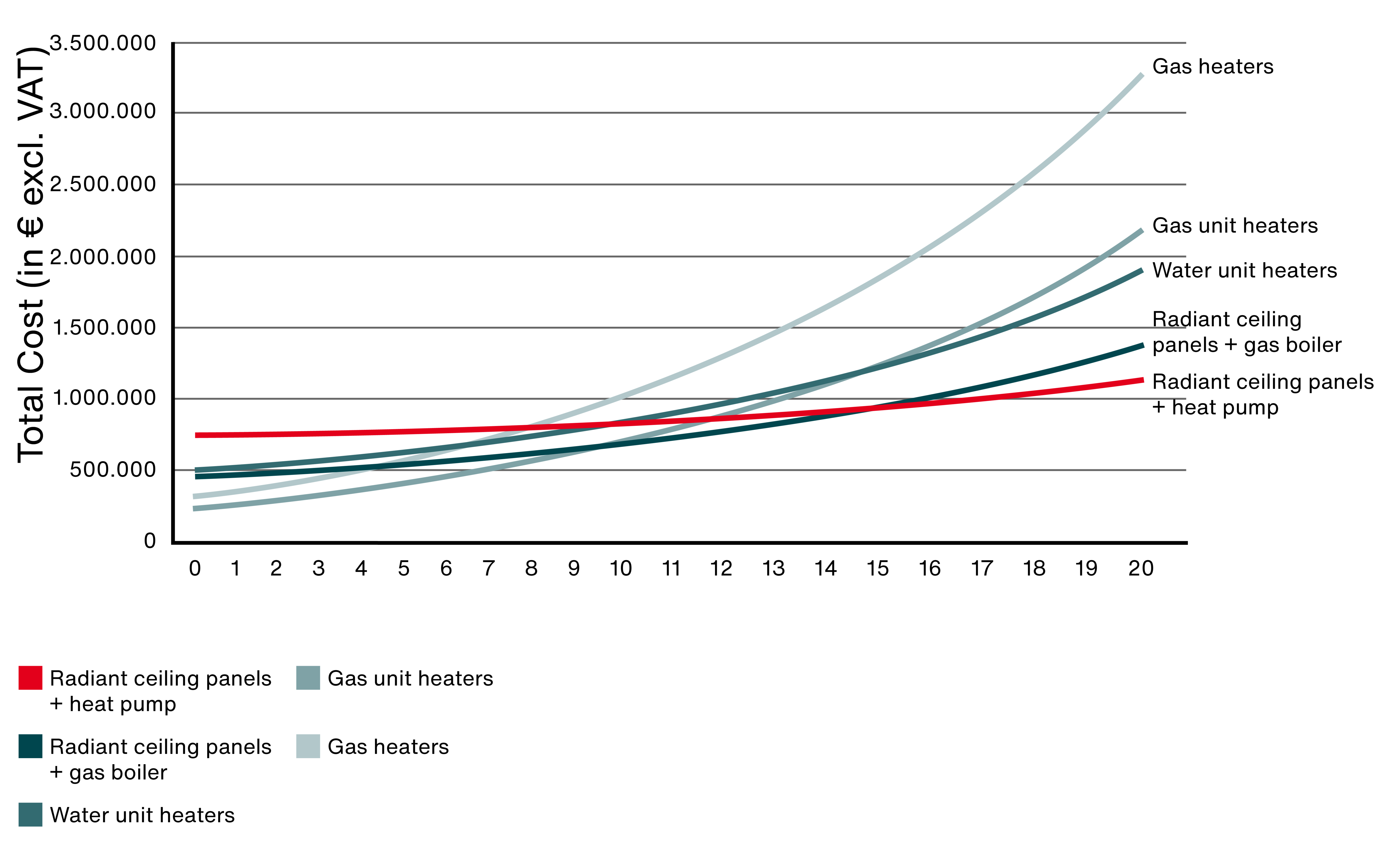 Radiant ceiling panels with heat pumps have the highest investment costs. In contrast, gas unit heaters have the lowest initial investment. In just under 8 years, the lower variable costs of radiant ceiling panels with heat pumps have amortised the higher investment compared to gas unit heaters. After a service life of 15 years, radiant ceiling panels with heat pumps save up to 59 % of the costs of other heating systems. Radiant ceiling panels with gas boilers save costs of up to 49 %.