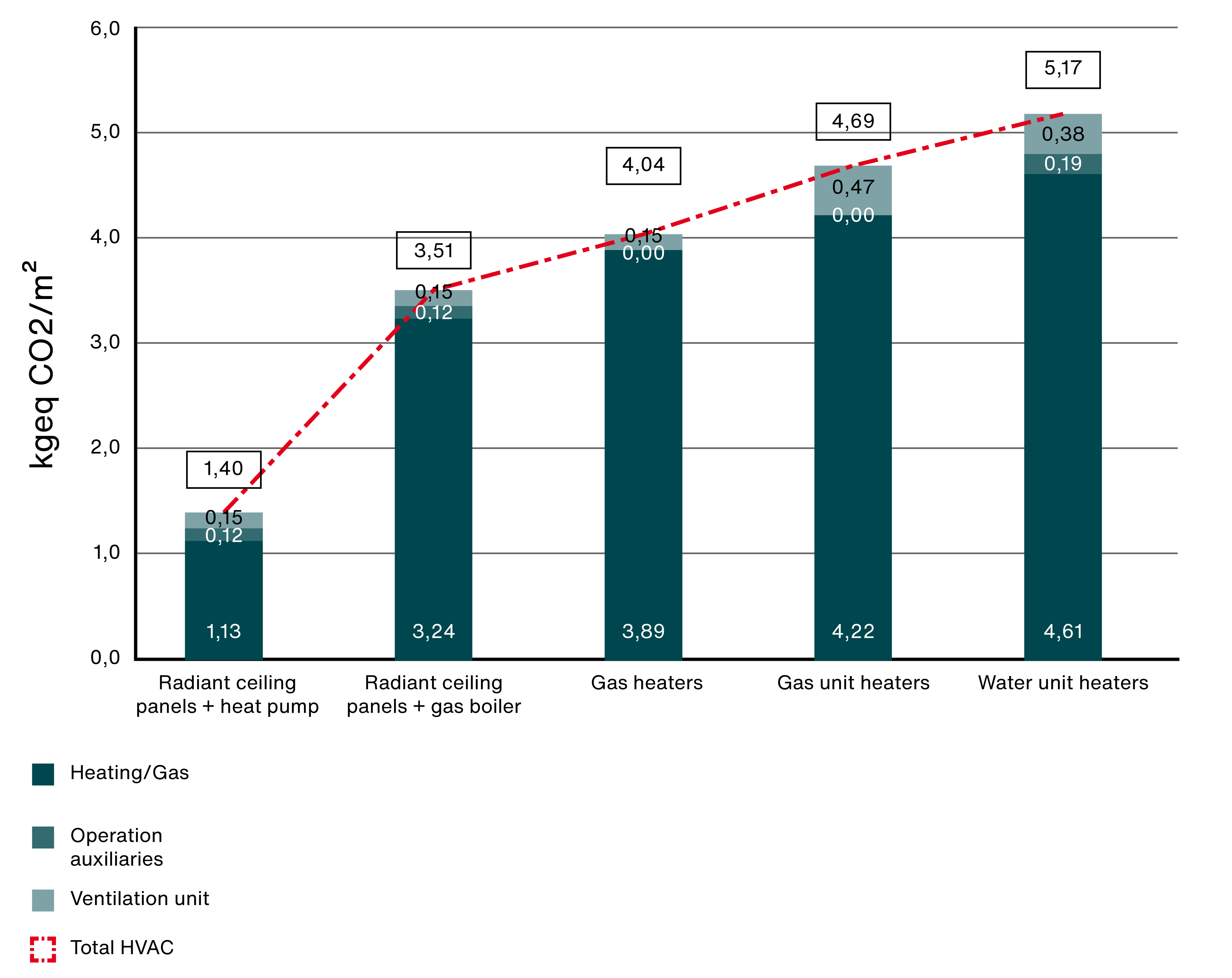 The heating system of radiant ceiling panels with heat pumps reduces energy consumption by up to 59 % compared to other systems. When using gas as an energy source, radiant ceiling panels with a gas boiler are the most efficient solution. Compared to a water unit heater, the use of radiant ceiling panels as heat emitters saves 22 % energy.