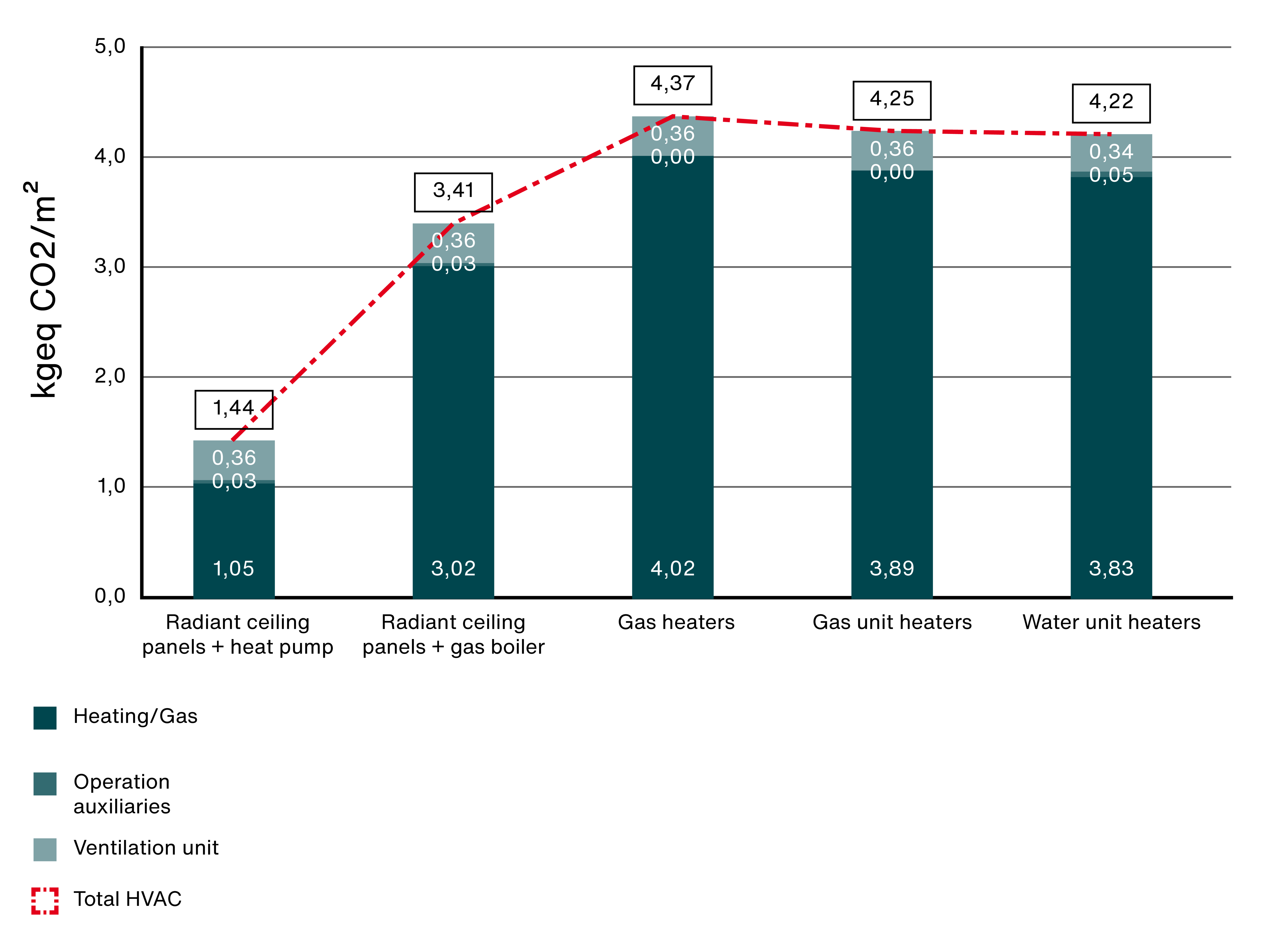 The most energy-efficient heating system is radiant ceiling panels with heat pumps. These reduce energy consumption by up to 45 % compared to other systems. When using gas as an energy source, radiant ceiling panels with a gas boiler are the most efficient solution. Compared to a water unit heater, the use of radiant ceiling panels as heat emitters saves 15 % energy.