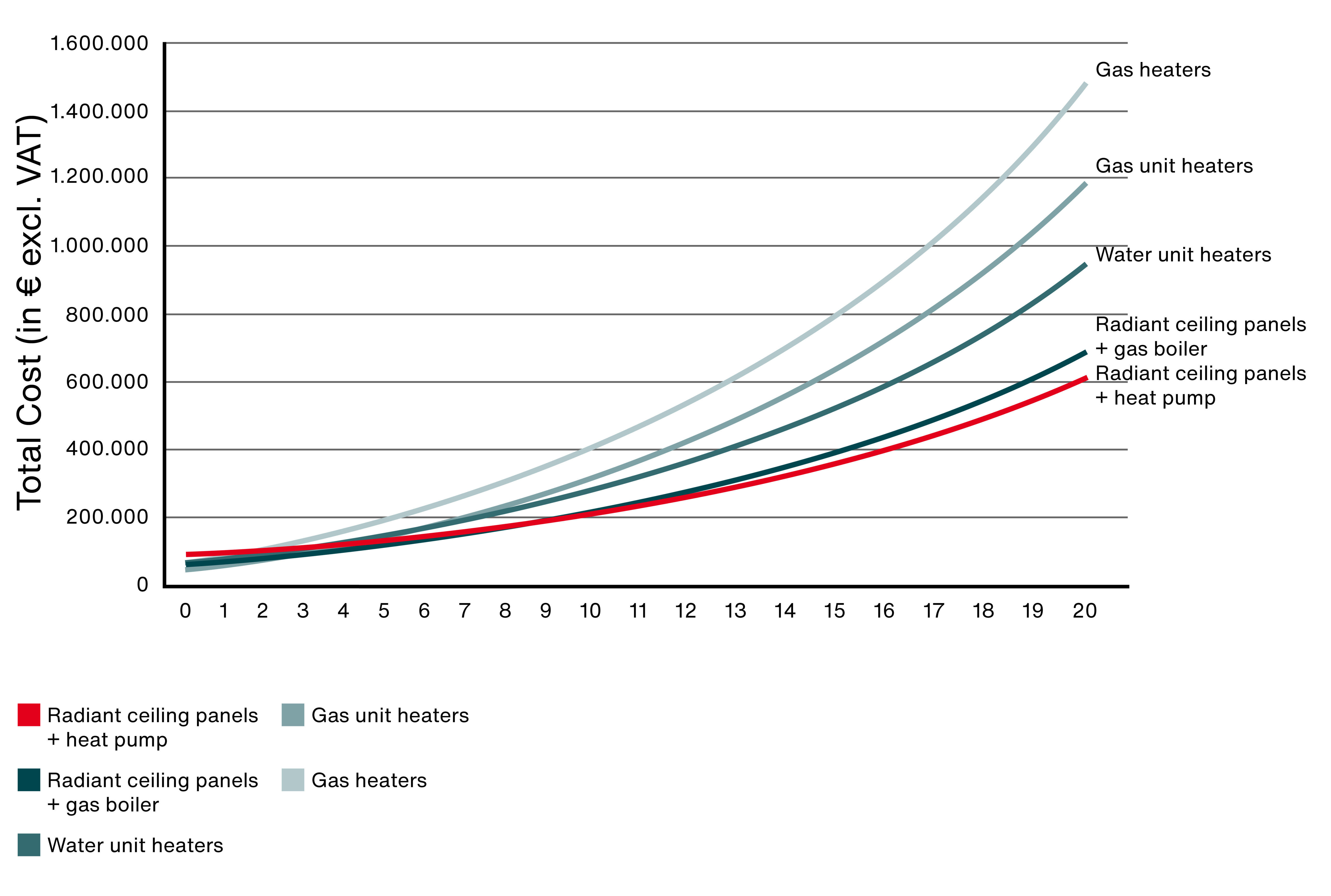 Radiant ceiling panels with heat pumps have the highest investment costs. In contrast, gas unit heaters have the lowest initial investment. In just under 3 years, the lower variable costs of radiant ceiling panels with heat pumps have amortised the higher investment compared to gas unit heaters. After a service life of 15 years, radiant ceiling panels with heat pumps save up to 55 % of the costs of other heating systems. Radiant ceiling panels with gas boilers save costs of up to 50 %.