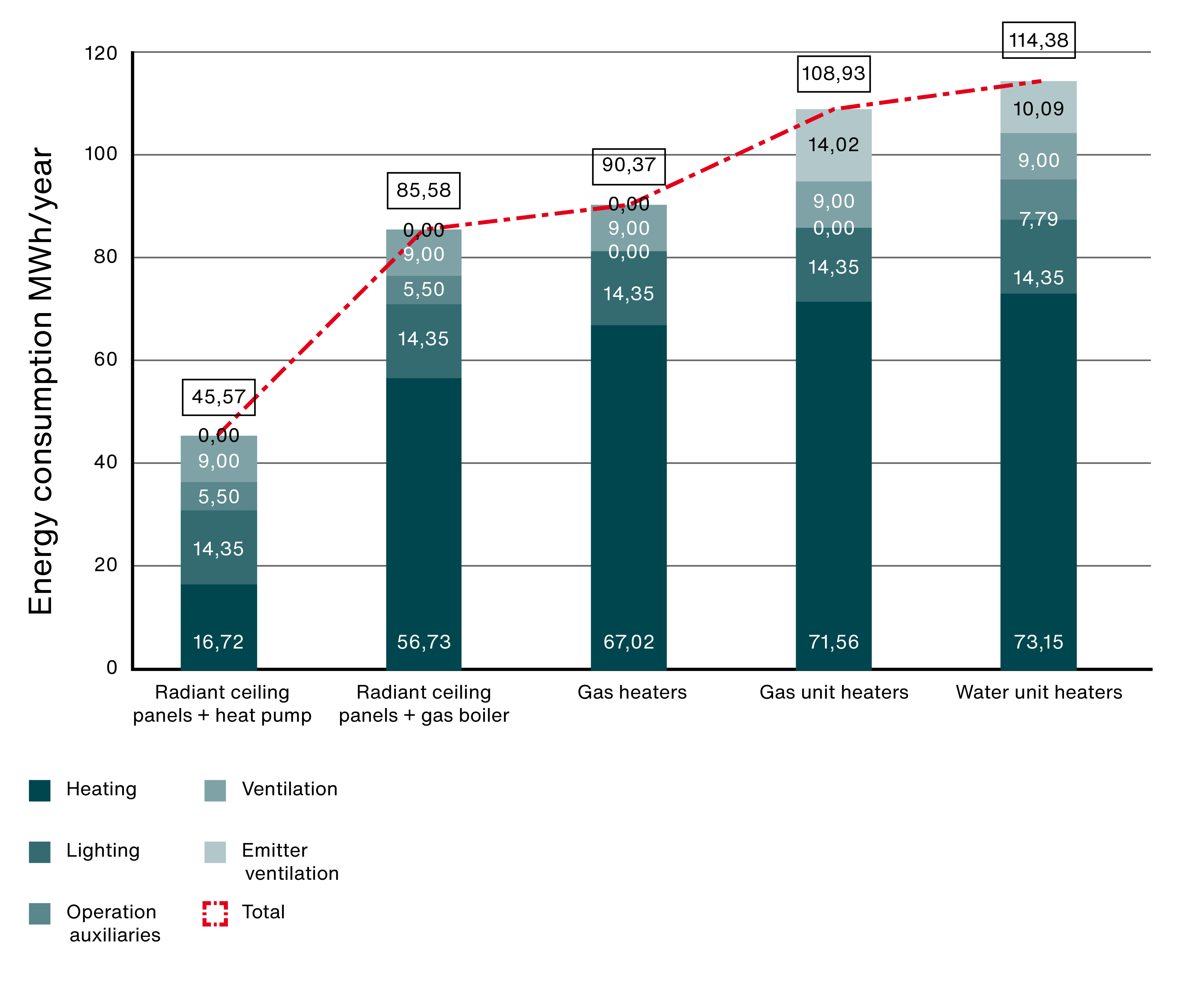 The most energy-efficient heating system is radiant ceiling panels with heat pumps. These reduce energy consumption by up to 60 % compared to other systems. When using gas as an energy source, radiant ceiling panels with a gas boiler are the most efficient solution. Compared to a water unit heater, the use of radiant ceiling panels as heat emitters saves 25 % energy.