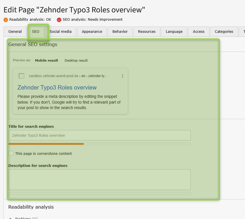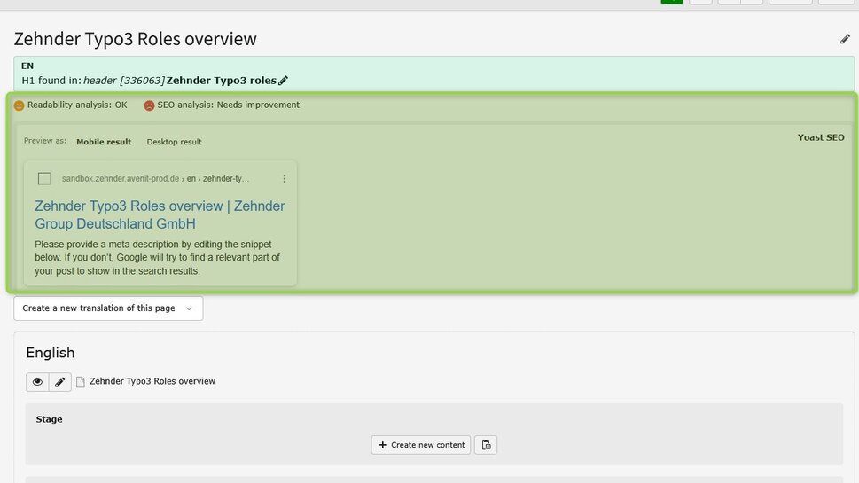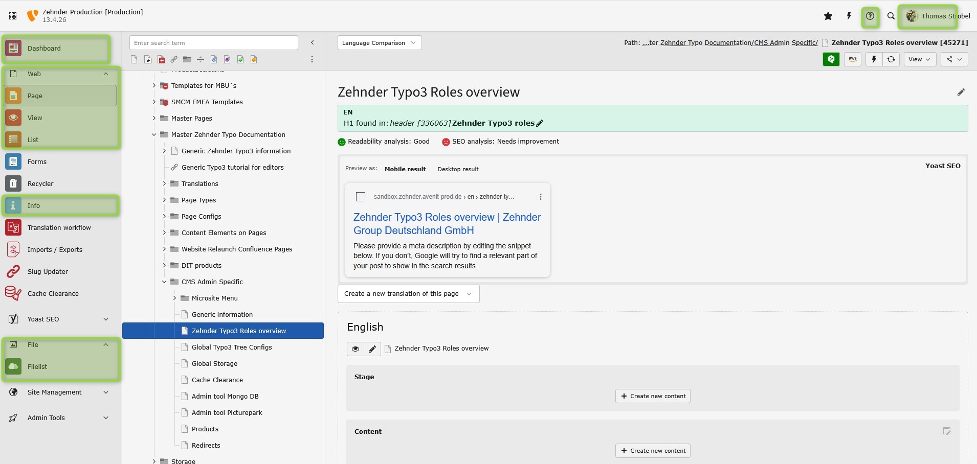 Based on basic typo3 in combination with Zehnder specific custom developments there exist different roles, access and config options within the system setup. This overview will be filled along onboarding process with Market related CMS specialists.
