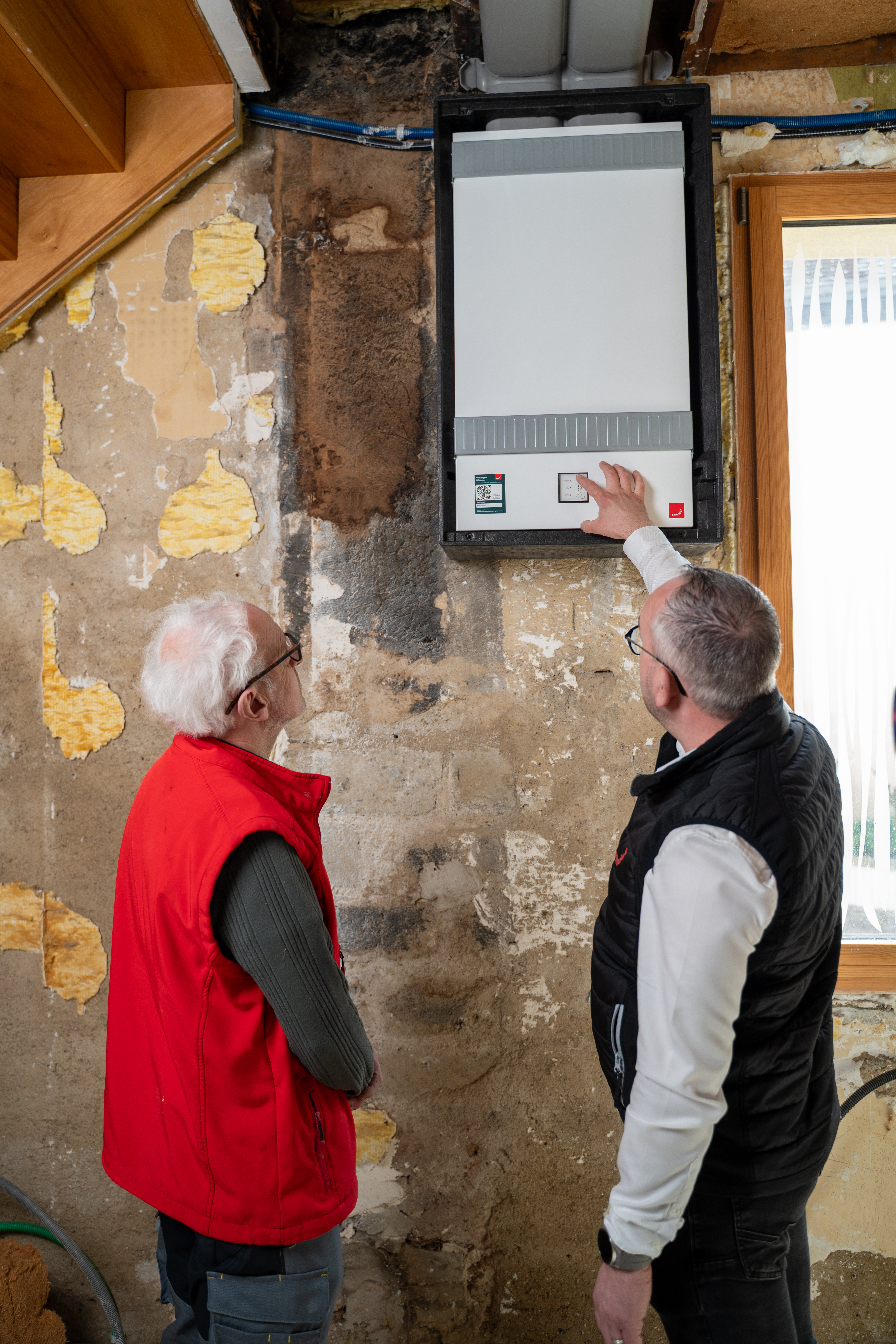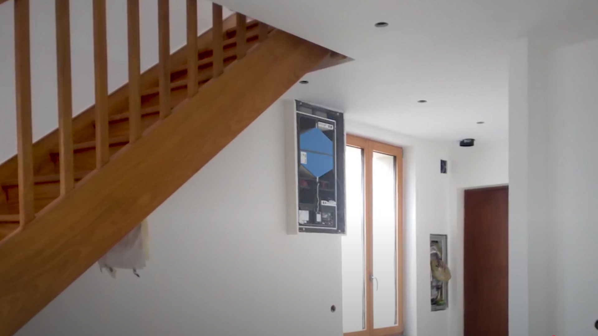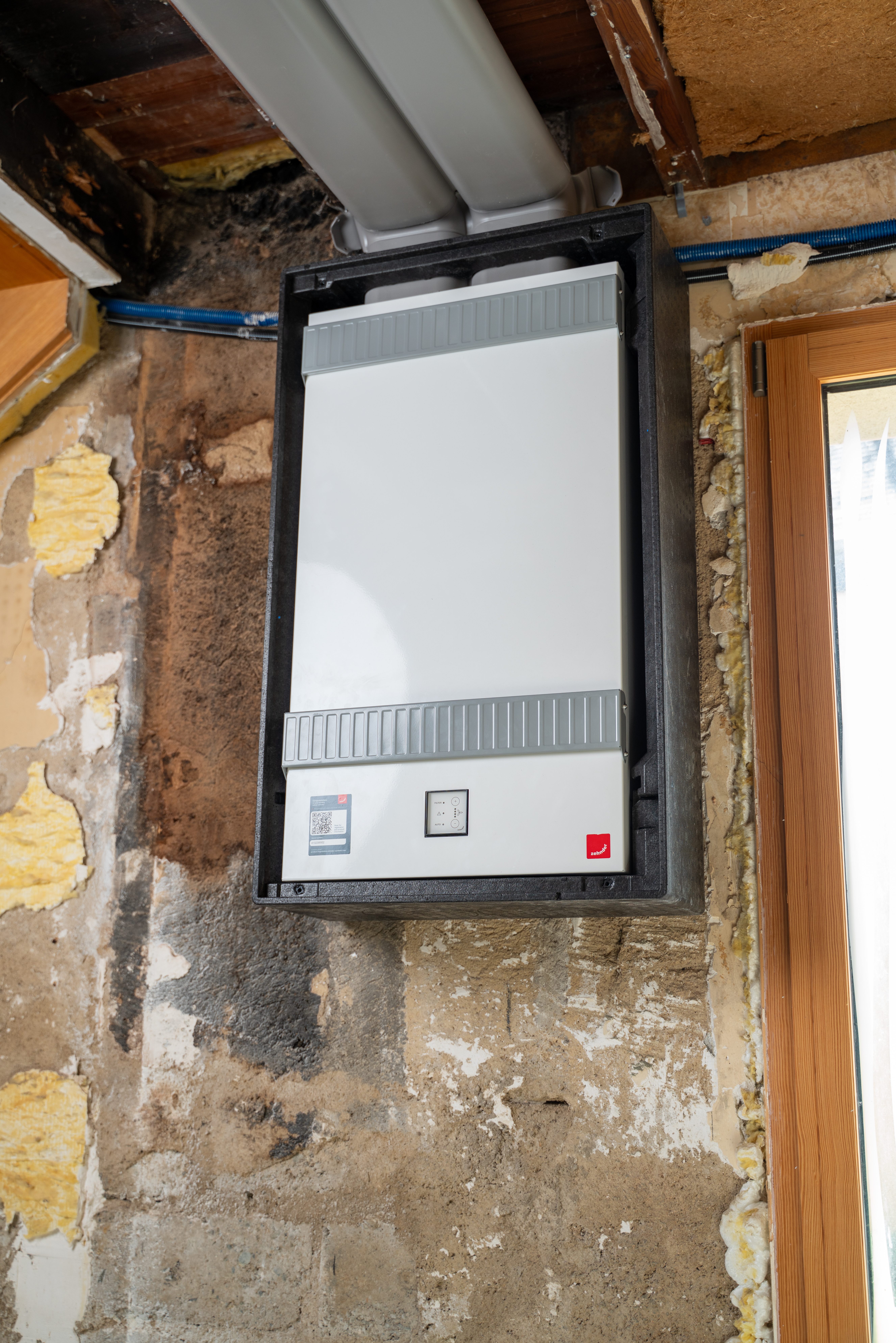 Pour répondre aux fortes contraintes d’espace de ce projet de réhabilitation, la solution de ventilation double flux semi-décentralisée Zehnder ComfoAir Fit 100 a été retenue. Grâce à son design compact (L 465 x H 821 x P 216 mm) et à sa pose murale encastrée, elle s’intègre avec discrétion et élégance dans l’architecture du logement, sans empiéter sur l’espace de vie.
