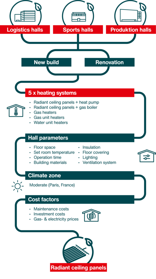 I pannelli radianti a soffitto sono i chiari vincitori dello studio e consentono un risparmio energetico fino al 70% rispetto agli altri sistemi. Per motivi di rilevanza, ci concentriamo su grandi sale nella zona a clima moderato.