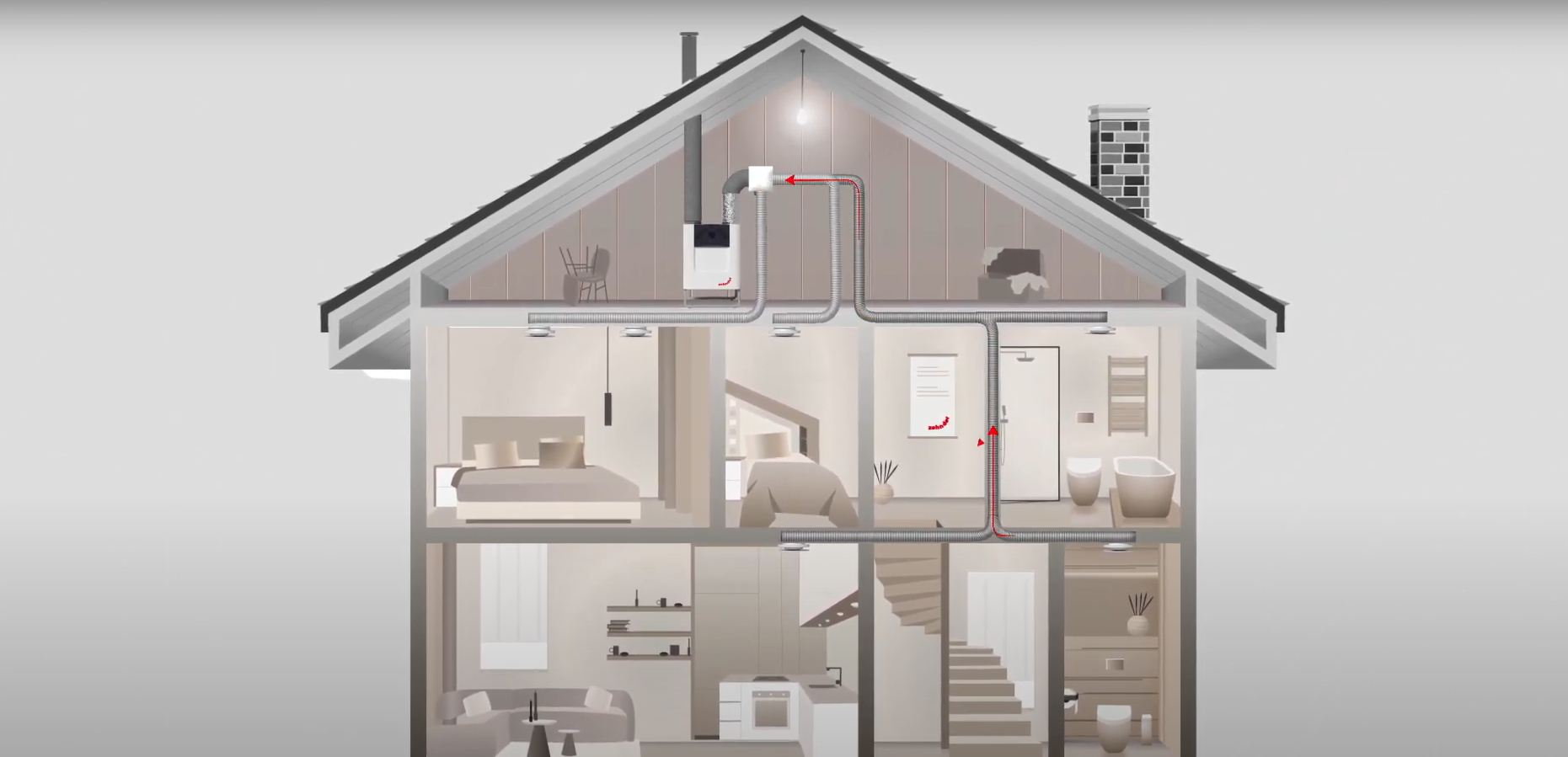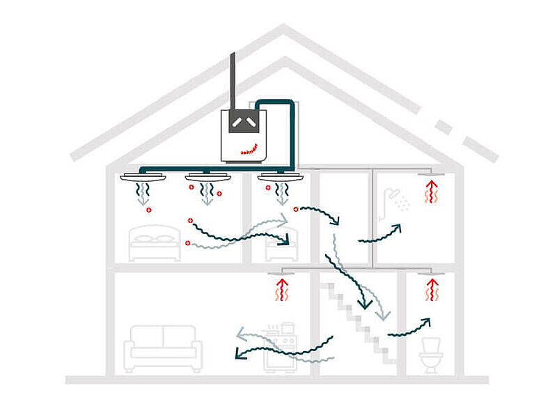 Simpel. Overflow Technology haalt extra lucht van buiten, naar binnen. Daarvoor vervang je eenvoudig de mechanische ventilatie op zolder door een wtw-unit. De ComfoAir Q of E bijvoorbeeld. Er zijn alleen nieuwe toevoerkanalen naar de eerste verdieping nodig. De wetten van de natuur doen de rest: die trekken de extra lucht, via de overloop, naar beneden. Daar is geen toevoer nodig. En de afvoerkanalen? Die zijn er al. Minder materiaal, minder breken, minder overlast.