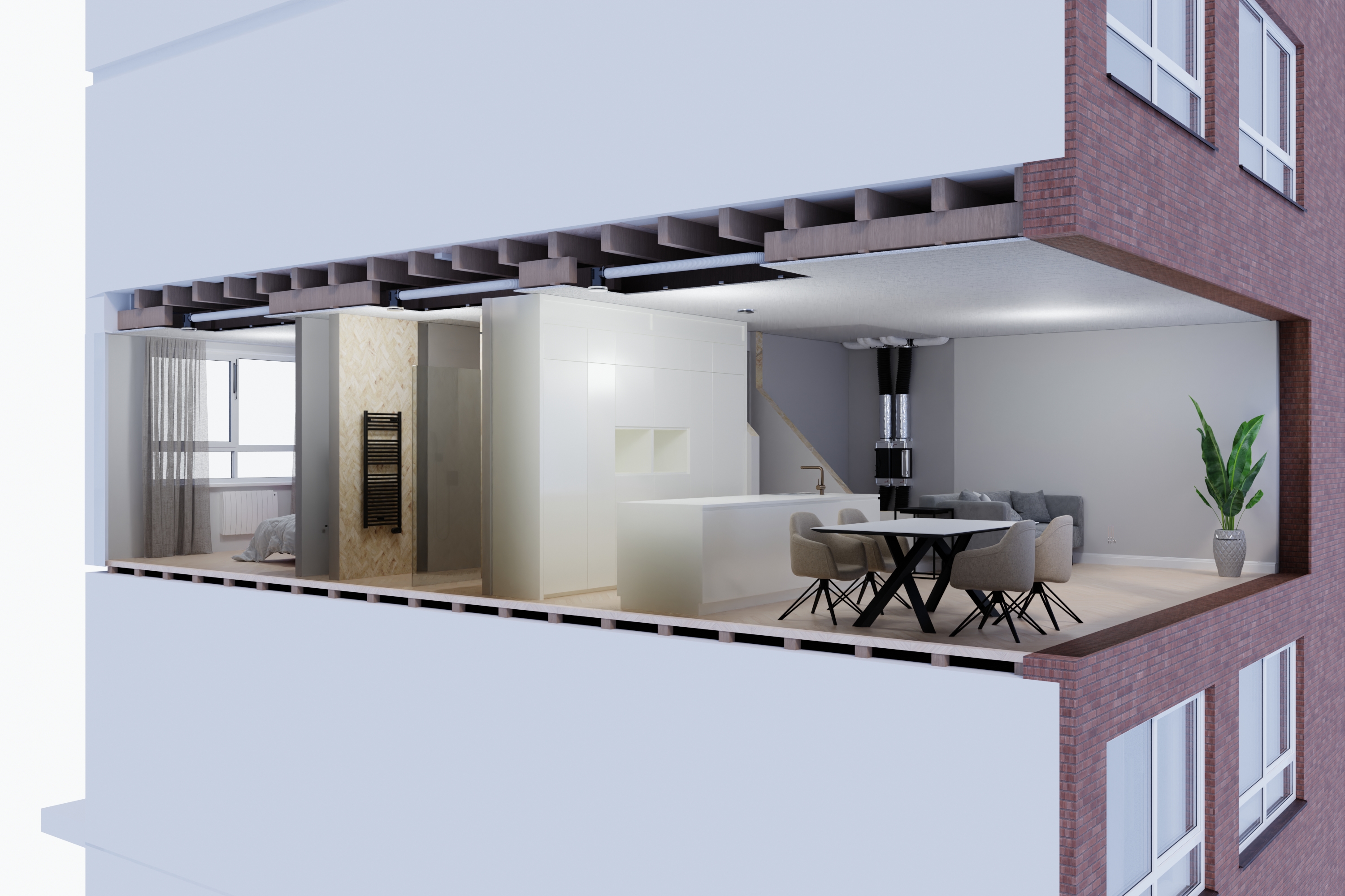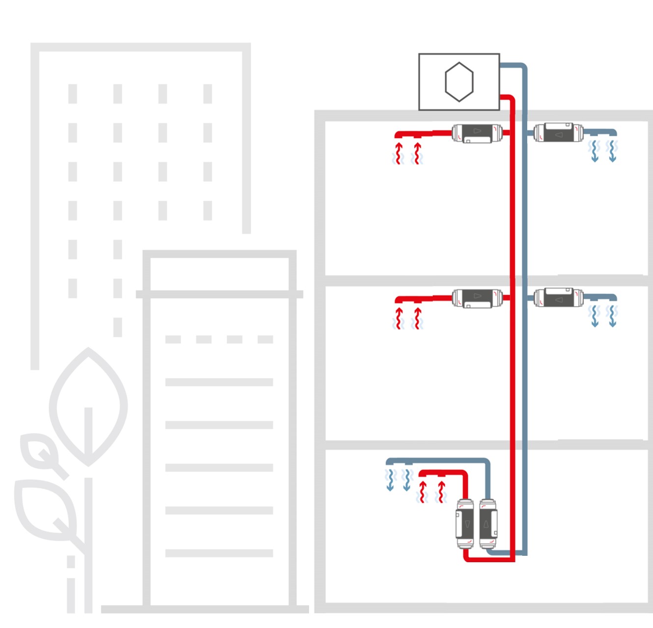 Vanuit de luchtbehandelingskast worden er vervolgens twee kanalen naar de appartementen aangelegd: één voor de toevoer en één voor de afvoer. De luchtbehandelingskast werkt op constante druk in de kanalen. Daardoor toert de luchtbehandelingskast automatisch op als een luchtvolume-regelaar in het appartement verder open gaat en toert deze automatisch af als deze verder dicht gaat.
